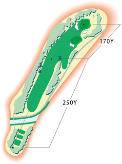 ティーショットは川越え。コースは緩やかに右カーブしているが、右の林に気をつけて。