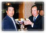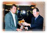 | 6月18日(日)に開催されたキャプテン杯。長部キャプテンから本年度の優勝カップを手渡されたのは川上秀人様です。決勝戦の後は終始和やかな雰囲気で交流の場が持たれました。 |